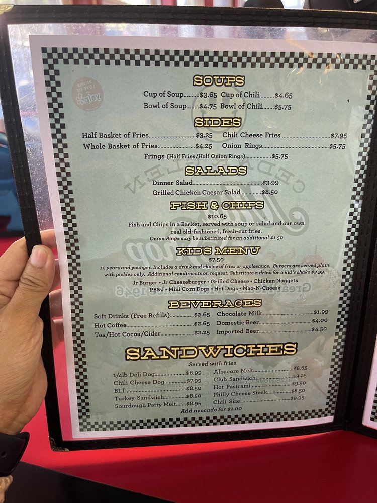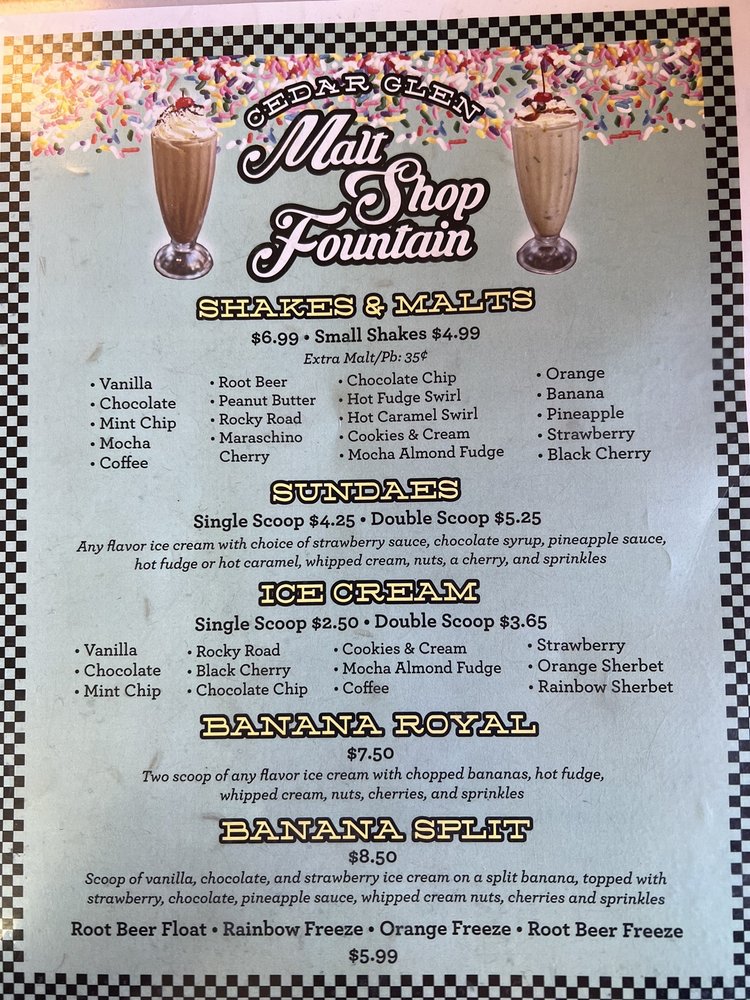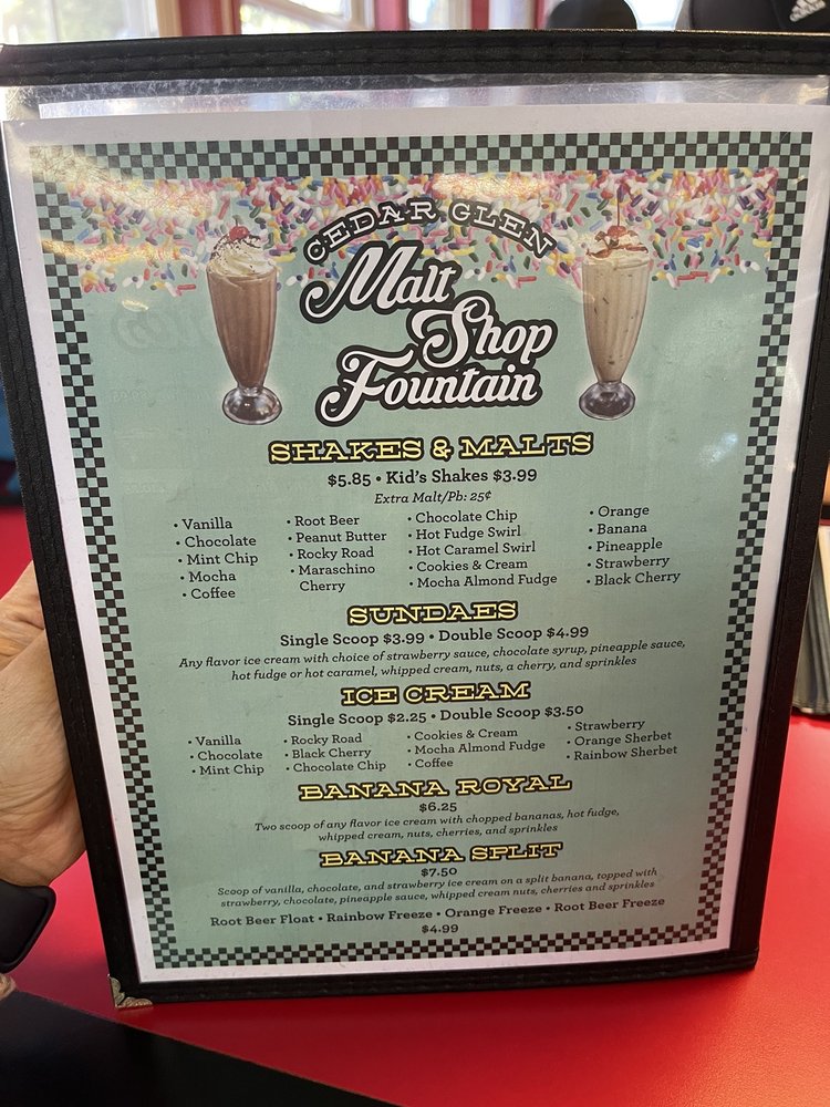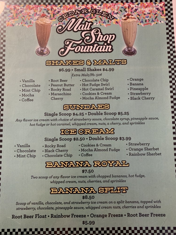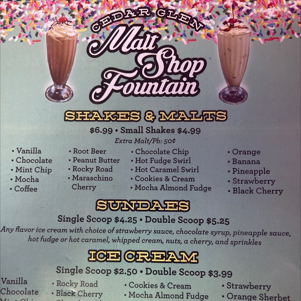 Introducing the menu at Cedar Glen Malt Shop, located in Cedar Glen, CA, a hidden gem offering American cuisine. The restaurant provides a casual, family-friendly atmosphere with a variety of delicious burgers, fries, and milkshakes. Reviews rave about the generous portions, fresh flavors, and friendly service. Customers recommend trying the classic chocolate malt or the inventive Stingray burger. Despite limited seating and parking, the nostalgic ambiance, complete with old-school jukebox music, adds to the overall dining experience. With a focus on quality ingredients and quick service, Cedar Glen Malt Shop is a must-visit destination for burger and shake enthusiasts seeking a taste of the past. Visit for a filling meal that will leave you satisfied and craving a return trip.